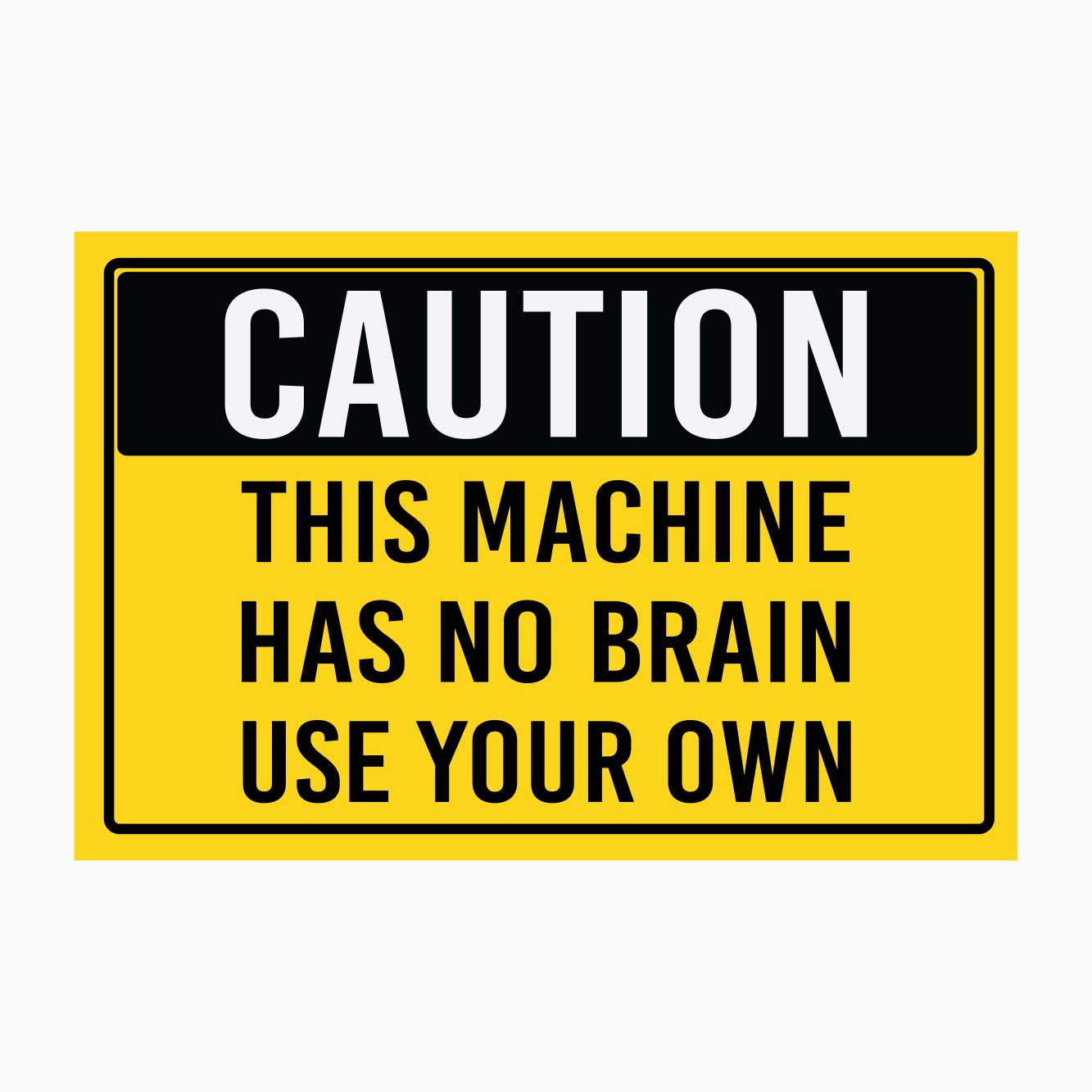 CAUTION: THIS MACHINE HAS NO BRAIN — USE YOUR OWN sign is a humorous yet effective reminder for safe machine operation. It’s commonly displayed on or near machinery that could pose risks if used improperly, especially in workplaces like factories, workshops, or warehouses where people interact with equipment. The message encourages users to stay alert and rely on their judgment rather than assuming the machine will account for safety on its own. This sign is useful wherever workers might forget that even though machines are helpful, they still require caution and mindful operation to prevent accidents.