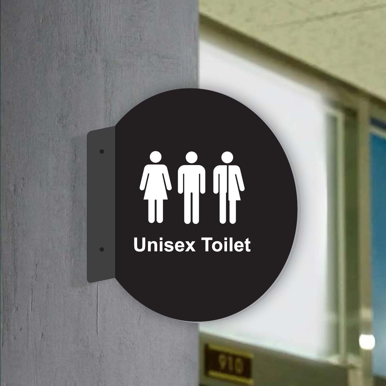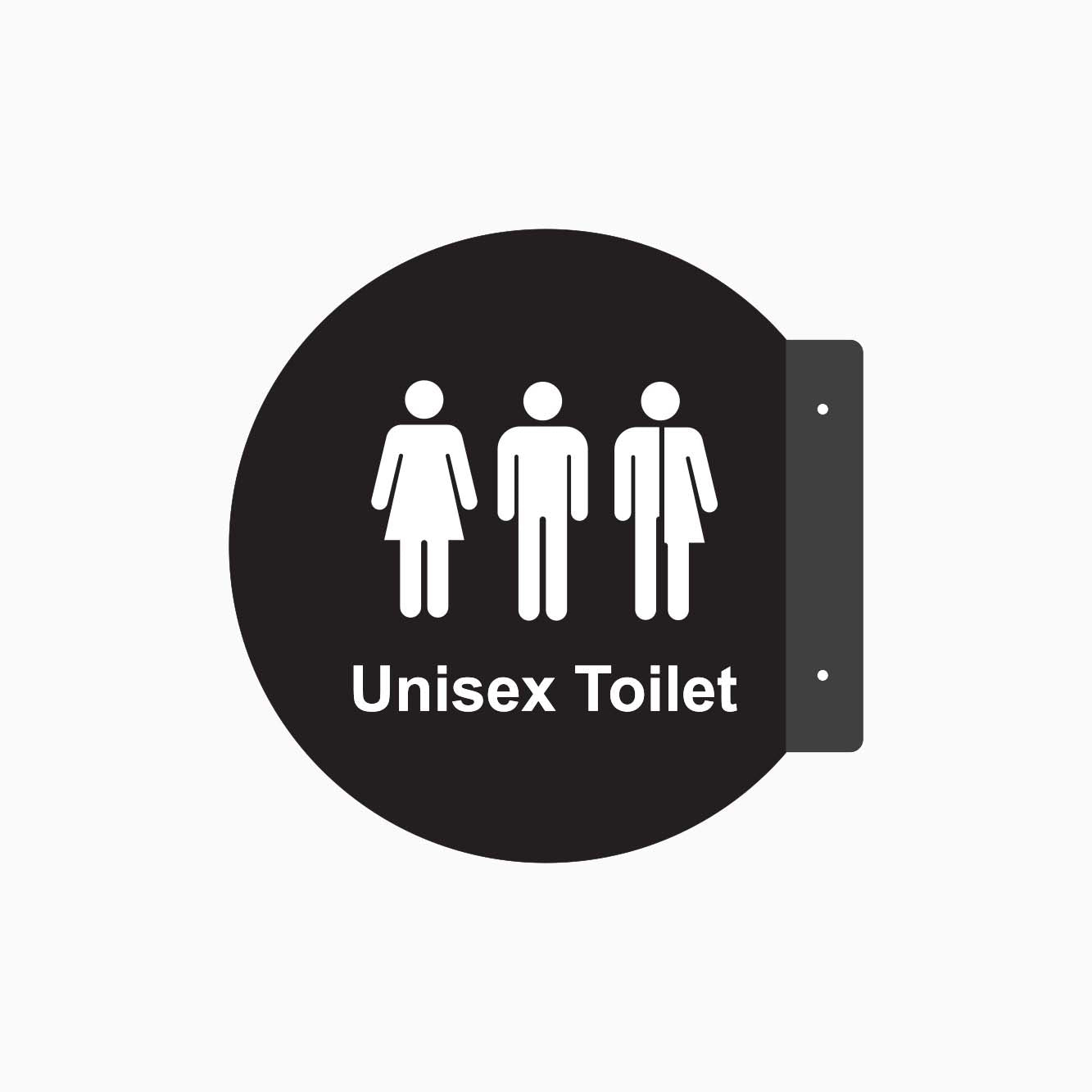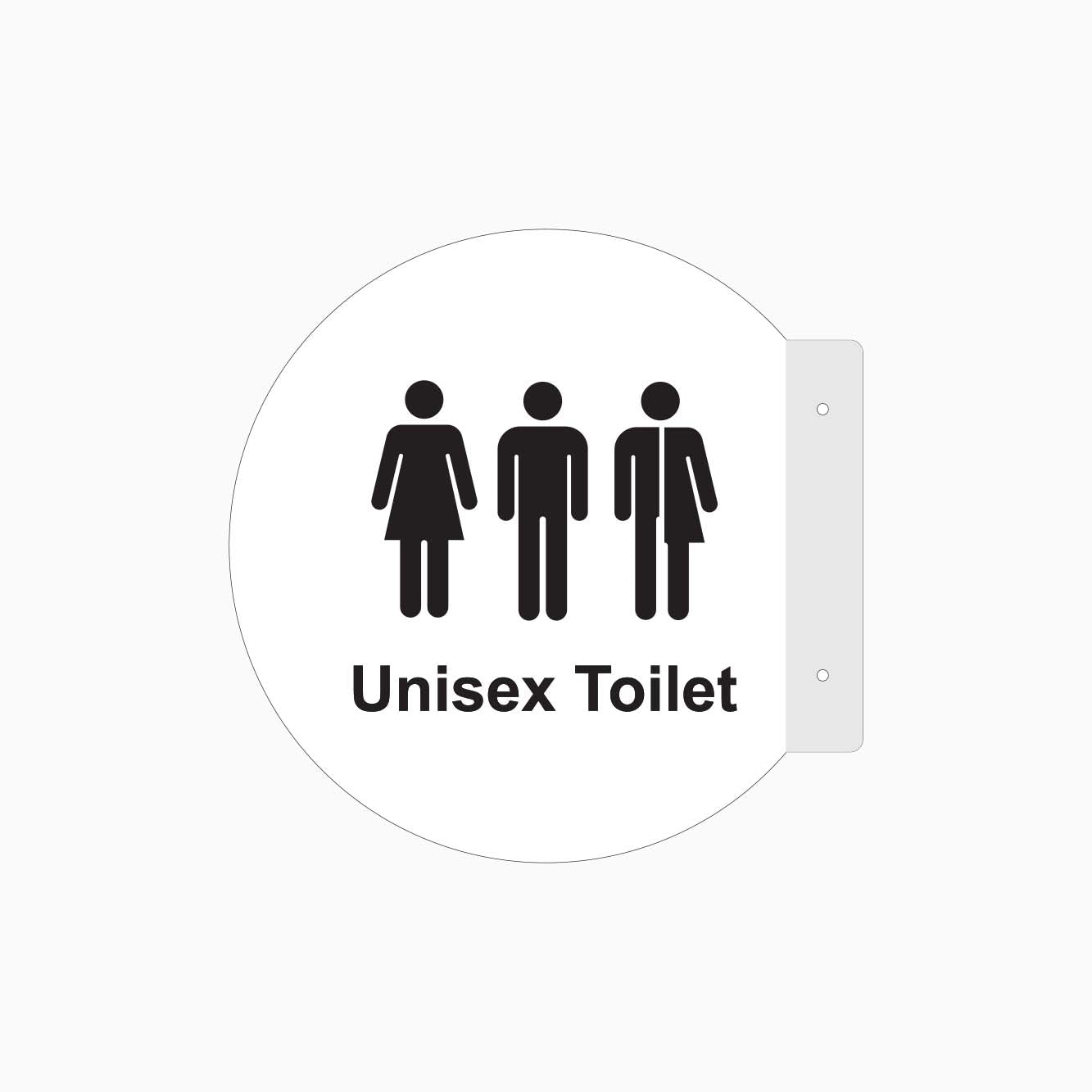 Double Sided Circle Blade Unisex Toilet Sign is the perfect way to guide people to toilet locations with style and simplicity. This sign features graphics and lettering on both sides, ensuring visibility from multiple angles. It’s designed for easy installation with two holes on the folded side, and screws and caps are included in the sign package. Ideal for both indoor and outdoor use. We can also customize the sign with your graphics, wording, and color. Contact us to order your custom sign!